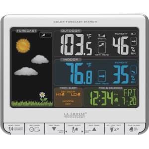 Cette jolie station météo affiche l'heure et la date, la prévision météo, la température et l'hygrométrie intérieure/extérieure avec rappel des min./Max du jour et des tendances et elle affiche l'indice de chaleur et le point de rosée. Ce modèle dispose d'une alarme de température et d'un port USB pour recharger divers types d'appareils nomades.