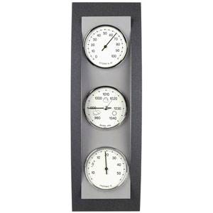 Trois indicateurs analogiques : thermomètre (-10 à 55°C), hygromètre (0 à 100%), baromètre (980 à 1040 hPa). Aluminium couleur anthracite.